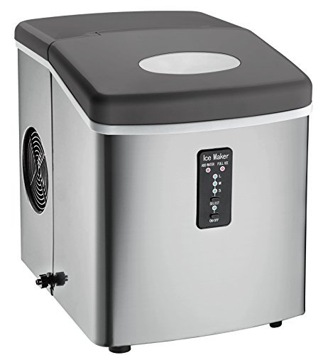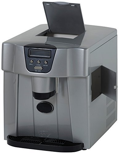 This unit offers an oversized stainless steel ice bucket that holds over two pounds of ice and offers a choice of three cube sizes. It goes from water to ice in six minutes and makes more than 25 pounds of ice per day. Customers report pleasure and even surprise at the performance of this little machine, and some say they have used it continuously for a year, never turning it off. However, some say this one is fairly large at 14 x 12 x 15 inches to keep on a counter.